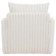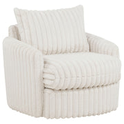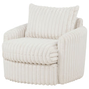 Contoured for comfort and wrapped in plush texture, this swivel chair invites relaxed movement with a soft, sculptural silhouette. Deep channel tufting traces every curve, from the wide seat to the tailored backrest and arms. Fully upholstered in ribbed corduroy and built with layered foam, this lounge chair rotates 360 degrees for flexible conversation. Ideal for modern living rooms, reading corners, or cozy bedrooms. Key Features: • Swivel chair in ivory corduroy features deep channel tufting and soft sculptural shaping • Full 360-degree swivel base allows flexible movement in open or compact spaces • Thick foam cushions provide a plush seating experience with lasting support • Fully upholstered arms and back offer a continuous wrap of ribbed corded texture • Framed in engineered wood for durability and built-in strength beneath soft contours • Modern swivel lounge chair suits bedrooms, living rooms, or cozy reading spaces