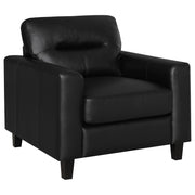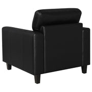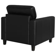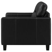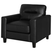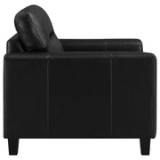 This lounge chair brings focused simplicity to the living room with strong lines and soft detail. Wide track arms wrap around the seat’s plush center, where smooth upholstery flows across each surface with quiet ease. Subtle tailoring enhances its sculpted calm. Whether placed solo or paired within a set, it delivers comfort and structure in equal measure—grounded, timeless, and always welcoming. Key Features: • Accent chair with track arms and supportive seat for individual relaxation • Black leatherette finish wraps seat in smooth, easy-care upholstery • Defined edges and topstitching create bold lines and sharp visual form • Straight legs in matching black keep focus on the structured silhouette • Constructed with plywood, foam cushions, and synthetic leather upholstery • Works as a standalone chair or integrated into a full seating arrangement