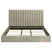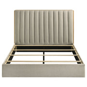 A striking balance of softness and ingenuity, this storage bed is a true centerpiece. A plush, vertical channel-tufted headboard is embraced by light oak bookcase panels, each with three open shelves that glide outward on hidden casters. Wrapped in textured fabric and built with engineered wood and a durable laminate veneer, the supportive platform base offers comfort and stability with a touch of modern grace. Key Features: • Queen bed with vertical tufted headboard and oak-framed sliding bookcase panels • Three-tier open shelving on each side offers practical and adjustable storage • Panels glide outward on hidden casters for flexible bedside access and function • Upholstered platform frame in soft light tan fabric supports a clean modern look • Engineered wood frame finished in scratch-resistant, durable laminate veneer • Combines plush texture with built-in storage for seamless everyday bedroom use