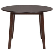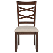 This five-piece dining set invites connection with timeless charm and everyday warmth. The round table, finished in rich dark brown, provides an intimate setting for shared meals and easy conversation. Four coordinating chairs feature gracefully curved double cross-backs and plush light tan upholstered seats that offer gentle support. Crafted from solid rubberwood, mango veneer, and soft-touch fabric, this set brings cozy elegance to kitchens, breakfast nooks, or dining spaces where comfort meets classic design. Key Features: • Five-piece dining set with round table and four cross-back upholstered dining chairs • Dark brown wood finish offers depth and warmth with classic appeal • Chairs feature gently curved double cross-backs for style and support • Light tan fabric seats are foam cushioned for comfortable daily dining • Crafted from solid rubberwood, mango veneer, engineered wood, and fabric • Perfect for breakfast nooks, kitchens, or small dining spaces with timeless style