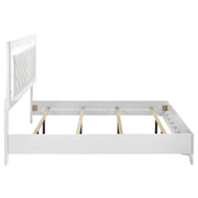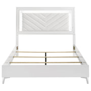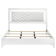This modern bed showcases a high-gloss white frame paired with a bold LED-lit headboard for striking impact. The panel headboard features a white faux leather insert with chevron channel tufting, framed by a white LED trim that casts soft ambient light. Clean edges and chrome-finished legs enhance its sleek silhouette, while the low footboard keeps the focus on the illuminated design. A foundation is required to complete this stylish bedroom centerpiece. Key Features: • Queen bed in high gloss white finish with bold chevron-tufted faux leather headboard panel • White LED trim around headboard adds ambient lighting and striking nighttime glow • Low-profile footboard and sleek rails keep the silhouette clean and contemporary • Faux leather insert offers soft touch and durable contrast against polished frame • Chrome-finished tapered legs provide sturdy support and upscale modern detail • Crafted from engineered wood, faux leather, and foam; foundation required for use