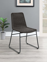 Place this transitional dining chair in a space for a hint of texture. Designed with a brown handwoven faux rattan across the seat, this charming chair offers a natural, boho-inspired vibe. Mounted on a black metal frame that offers all the support one needs, this lovely dining chair also offers vintage vibes with a flared base that lends an open, airy look. The sandy black slim frame also creates bold lines. Place this rattan-wrapped dining chair at a mid-century style dining table or allow it to grace a home office for extra guest seating. Key Features: • Transitional dining chair with a boho-inspired design • Features a brown handwoven faux rattan seat for a natural texture • Mounted on a sturdy black metal frame for ample support • Offers vintage vibes with a flared base for an open, airy look • Versatile use, perfect for a mid-century style dining table or as extra seating in a home office
