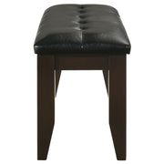 A versatile addition to any dining space, this dining bench offers both stylish seating and space-saving functionality. The solid rubberwood frame provides lasting durability, while the padded seat ensures comfort. A button-tufted design adds a sophisticated touch, while the sturdy legs provide reliable support. Designed for casual and formal dining spaces alike, this bench is perfect for families, guests, or everyday use, and easily tucks under the table when not in use. Key Features: • Stylish dining bench offers space-efficient seating for any dining room • Warm cappuccino finish enhances its classic and versatile aesthetic • Padded seat upholstered in black faux leather for a refined, modern feel • Solid rubberwood construction ensures strength and durability for daily use • Button-tufted detailing adds a sophisticated and elegant touch to the seat • Compact design allows for easy storage beneath the table when not in use