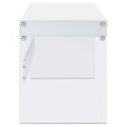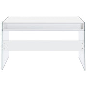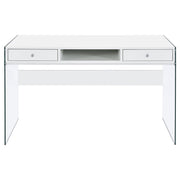 With its cool, contemporary appeal, this versatile writing desk works well in a bedroom or living room. It creates a functional space to work and study without sacrificing style. Bold, thick, tempered glass panels form its base supports, giving it an inspired touch of glamour. Its striking aesthetic is brought to life with a finish of glossy white. This desk is complete with an open center compartment and two drawers, adding extra convenience while maintaining its sleek look. Key Features: • Contemporary writing desk with clear glass side panels and white top • Two drawers and one center cubby provide storage and function • High gloss engineered wood top adds a polished modern appearance • Tempered glass legs give the desk a floating visual effect • Sleek chrome-finished knobs complement the clean white design • Ideal for minimalist bedrooms, living rooms, or compact offices
