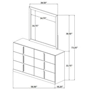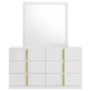Sleek and symmetrical, this six-drawer dresser with mirror offers bold style inspired by Italian contemporary design. The white high gloss finish is crafted from eco-friendly PET thermoplastic, offering exceptional scratch resistance, moisture protection, and long-term durability. Vertically mounted polished gold pulls create striking contrast, while the framed mirror completes the look with clean lines and reflective clarity. Key Features: • Six-drawer dresser with mirror inspired by bold lines and modern Italian influence • Eco-friendly PET thermoplastic veneer is scratch-resistant and easy to clean • PET surface resists heat, moisture, and UV fading for long-lasting durability • Polished gold pulls are vertically mounted for sculptural contrast and shine • Framed mirror adds height, symmetry, and practical reflection to the set • Drawers include English dovetail joints and smooth operating metal glides