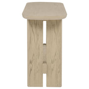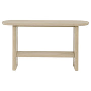 This console table embraces California coastal modern living with a design that blends authenticity and comfort. A 1970s-inspired base supports a rectangular top with softly rounded corners and a sculpted underside, lending a light yet grounded profile. Crafted from solid poplar, engineered wood, and oak veneer, it offers strength and natural appeal. A lower shelf enhances functionality, making this sofa table ideal behind a couch or as a console in an entryway or living room. Key Features: • Console table with rectangular top and sculpted underside in beige oak veneer • Sofa table base designed with 70’s inspired silhouette for coastal modern appeal • Solid poplar, engineered wood, and oak veneer construction ensures durability • Lower shelf provides extra space for storage or display in any living area • Smooth rounded edges highlight craftsmanship with a family-friendly profile • Occasional table doubles as sofa table or entryway console for versatile use