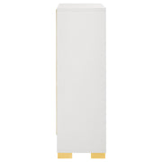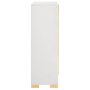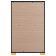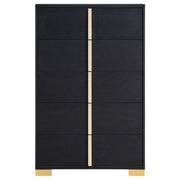 Minimalism never looked so elegant as it does in this elegant five-drawer chest, an excellent option for your updated bedroom ensemble. Modern design details produce a chic vertical chest with an Art Deco vibe and tons of storage space. Made of wood products, this five-drawer chest features a versatile finish with accenting from gold finish metal, placed carefully to emphasize a geometric linear effect. Store incidentals and accessories in drawers operating smoothly on center metal glides. English dovetail drawer construction embellishes this chest’s quality, as vertical gold metal drawer hardware offers a unique impact. Key Features: • Elegant five-drawer chest with modern design details and Art Deco vibe • Made of wood products with versatile finish and gold finish metal accents • Smoothly operating drawers on center metal glides with English dovetail drawer construction • Vertical gold metal drawer hardware for unique impact • Minimalist design with ample storage space