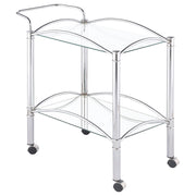 Simple elegance with a modern twist. This freshly styled serving cart offers a tasteful addition to contemporary decor. With a sleek chrome finish, its metal frame receives romantic curved accents. A tempered glass top shelf and mirrored bottom shelf accommodate beverages, food, and implements. Casters allow mobility to work the room easily. Key Features: • Classic serving cart is a conversation piece in any era • Chrome finish creates timeless look • Clear tempered glass top shelf and mirrored bottom shelf add visual intrigue and personality • Form and function include two (2) tiers of shelving with guardrails and casters • Steel and glass construction