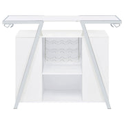 Pull out all the stops to breathe fresh energy and organization into a casual space dedicated to entertainment. Your needs are met with this modular-inspired and contemporary home bar constructed of MDF, paper coating, and veneer, all with a bright white finish. Metal framing is jazzy with a geometric motif, supporting a spacious top shelf ideal for beverage and snack prep. A center compartment features shelving and bottle racks, while the integrated LED strip located on the underside of the table top can change color. This handy bar unit transforms a compact space into a modern home-based venue for fun. Key Features: • Modular-inspired and contemporary home bar constructed of MDF, paper coating, and veneer with bright white finish and metal framing with geometric motif • Spacious top shelf ideal for beverage and snack prep, center compartment with shelving and bottle racks • Integrated LED strip located on underside of table top changes color • Transforms compact space into modern home-based venue for fun • Pulls out all the stops to breathe fresh energy and organization into casual entertainment space