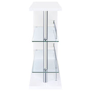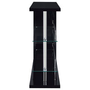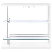 If you love to entertain, you'll love the charm and convenience of this fabulous, contemporary bar unit. With a sleek, stylish design, it looks elegant in a dining area or recreation room. Complete with a gorgeous gloss black finish and shining chrome accents, its bold silhouette makes a striking statement. This handsome unit includes two glass storage shelves for wine, glassware, and bar accessories. A handy wine glass holder rounds out its versatile appeal. Key Features: • Smaller footprint makes this contemporary bar unit a hit • Elegant, clear tempered glass shelves provide strength • Two (2) glass shelves with guardrails and stemware racks add storage and protect the stored items • Steel, MDF, particle board, and laminate construction • Choose from glossy black, glossy cappuccino, glossy white, or weathered grey
