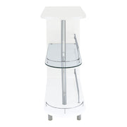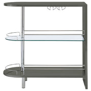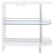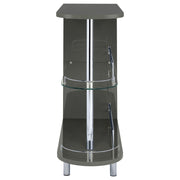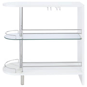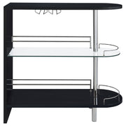 This stylish bar unit is a fabulous option for your entertaining needs. A sleek silhouette and glossy black finish give it a chic, modern appeal. Its tempered glass storage shelves offer a handy place to display a collection of fine wines and spirits. Protective guardrails help prevent accidental spills and keep bottles safe and secure. A handy stemware rack rounds out the versatile convenience of this contemporary bar unit. Key Features: • Rounded end adds an elegant feel to this glossy black bar unit • Clear tempered glass shelf adds stability for your choice of spirits • Storage features include two (2) tiers of shelving, including one (1) glass shelf with guardrails, and stemware racks • Steel, MDF, and laminate construction • Your choice of glossy black, glossy white, or glossy grey