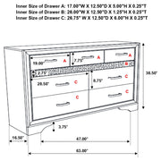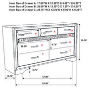 Encourage a glam vibe in your refined bedroom with a modern four-piece bedroom set. Centering on a stylish bed with an upholstered headboard and low footboard, the set includes a two-drawer nightstand for easy bedside storage and display space. A seven drawer dresser and mirror complete the set, adding diamond-like trim across its face that catches the light and offers a sophisticated touch. Bracket feet add a touch of dimensionality and movement to each piece and jewel-like bar pulls add intriguing sparkle. A cool white finish is textured, while white finish trim is smooth, creating a touch of textural contrast that add engaging style.