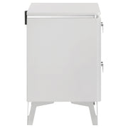 With its sculptural drawer fronts and crisp white high gloss finish, this nightstand brings a fresh, modern edge to the bedroom. Two spacious drawers feature dimensional geometric textures and sleek chrome-finished pulls, while the top drawer is lined in black felt for added refinement. Built-in USB-A and USB-C ports on the back offer convenient charging access. Metal extension glides and polished surface details complete this bold yet functional bedside table. Key Features: • Modern nightstand in white high gloss finish features sculptural geometric drawer fronts • Dual USB charging port includes both USB-A and USB-C access at the back for convenience • Two drawers offer storage with top drawer fully lined in black felt for a refined interior • Chrome-finished drawer pulls complement the bold dimensional pattern and sleek surface • Equipped with 45mm metal extension glides for smooth and quiet operation • Crafted from engineered wood for clean lines and durable everyday use