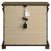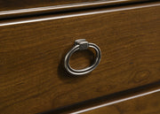This three-drawer nightstand blends traditional shaping with modern utility at the bedside. Crown molding and antique nickel ring pulls complement the warm brown cherry finish, while the felt-lined top drawer offers secure storage for accessories. A dual USB charging port (USB-A and USB-C) is mounted on the back for convenient overnight charging. Built from solid rubberwood, engineered wood, and cherry veneer for lasting elegance. Key Features: • Three-drawer nightstand with crown molding and softly shaped traditional silhouette • Brown cherry finish enhances classic case lines with rich, neutral visual warmth • Antique nickel oval ring pulls provide decorative contrast and vintage appeal • Top drawer includes felt lining and tinted interior for secure bedside storage • Dual USB charging port with USB-A and USB-C is mounted discreetly on the back • Crafted from solid rubberwood, engineered wood, cherry veneer, and plywood