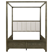 Transform your bedroom into a sophisticated retreat with this transitional canopy bed. Featuring rounded corners and trending design details, this bed offers a perfect blend of style and stability. The headboard is upholstered in textured beige fabric with vertical channeling, adding a touch of elegance. Finished in dark cocoa, the bed is crafted from solid hardwood and ash veneer, ensuring durability and a timeless look. Enjoy the luxurious feel and refined aesthetic of this beautifully designed canopy bed. Key Features: • Transitional queen canopy bed with rounded corners and trending design details • Textured beige fabric headboard with vertical channeling • Dark cocoa finish for a sophisticated look • Crafted from solid hardwood and ash veneer for durability • Available in queen, eastern king, and California king sizes