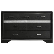 Infuse your space with sophisticated grace. The chic design of this beautiful dresser lends a touch of elegance to any bedroom. Felt-lined drawers keep delicate belongings safe and secure. A hidden jewelry drawer offers a discreet place to store your valuables. Complete with a glittery panel across the front, this piece exudes sparkling opulence. Key Features: • Nine-drawer dresser provides ample clothing storage • Hidden felt-lined drawer located behind glitter accent strip • Crystal hardware stands out against bright white surfaces • Smooth drawer operation with full-extension glides • Bracket-style base and beveled edges offer timeless form • Engineered wood and laminate build ensure durability