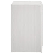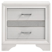 Infused with timeless glamour, this three-drawer nightstand brings refined character to any bedroom. Its linear profile is accented by elegant framing and a glittering center panel that conceals a hidden felt-lined drawer, ideal for delicate accessories. Smooth metal-extension glides ensure effortless drawer operation, while crystal-inspired pulls catch the light with radiant sparkle. Built from engineered wood and finished in a textured laminate veneer, it delivers durability with sophisticated transitional charm. Key Features: • Three-drawer nightstand with smooth full-extension glides • Hidden felt-lined drawer concealed behind glitter accent panel • Crystal drawer pulls enhance the glamorous design • Bright white finish with subtle textural detail on sides • Classic bracket base offers transitional styling • Crafted from engineered wood with laminate surfaces