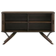 Elevate your dining area with this mid-century modern server. Beautifully designed with campaign style influences, this contemporary server rests on striking flared legs that offer a retro-inspired aesthetic. Tambour doors with finger-tip pulls bring out a nautical expression and a vintage touch. Open the cabinet doors and you will find ample space for all your dishes, stemware, and more. A rich, dark walnut finish brings out charming details. Key Features: • Casual dining can look elegant and still be functional for busy homes • Server with tambour doors offers plenty of storage • Fingertip pulls on each door lend a nautical aesthetic • Flared tapered legs bring a bold, mid-century modern vibe • Two removable shelves invite you to store and organize as you wish