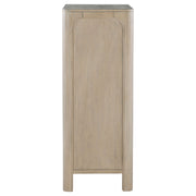 Gracefully composed with rounded edges and sculptural form, this five-drawer chest evokes a quiet sophistication. Its tall silhouette offers a sense of order, while sculpted corners and subtle detailing bring soft elegance to the bedroom. A felt-lined top drawer and hidden compartment add thoughtful layers of function. Crafted with care and presence, it offers both beauty and intrigue in equal measure. Key Features: • Five-drawer chest with sculpted corners and softened lines for elegant bedroom storage • Weathered mango finish enhances natural grain with a relaxed, organic texture • Felt-lined top drawer offers gentle protection for jewelry, watches, or accessories • Secret nested drawer in second drawer from top provides discreet storage • Heavy duty drawer glides ensure smooth, lasting drawer operation • Crafted from mahogany, engineered wood, and mango veneer for strength and style