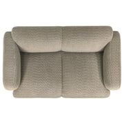 This sculpted loveseat brings bold softness and inviting texture to modern spaces. Its low-profile frame is wrapped in richly textured fabric with a cozy, tactile feel. Rounded track arms and a smooth, contoured silhouette create a cocoon of comfort. High-quality foam and pocket coil seating ensure long-lasting support without sacrificing softness. With a clean, minimal form, this two-seat loveseat adds warmth and refined presence to any living room or lounge. Key Features: • Two-seat loveseat with low-profile, sculptural silhouette and soft, rounded edges • Textured white fabric upholstery offers warm tone and inviting hand feel • Curved track arms and contoured frame provide supportive modern style • High-quality foam padding adds plush comfort to every seating zone • Pocket coil seating delivers durable support and shape retention • Perfect for compact living spaces seeking soft form and relaxed design