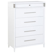 This bedroom set combines soft curvature and linear polish in a clean modern silhouette. Each piece features elongated brushed nickel pulls and subtle vertical tube accents that frame smooth white surfaces. The bed softens the look with a light grey upholstered headboard and footboard, adding contrast and comfort. Built from solid rubberwood, engineered wood, and laminate veneer, this set balances elegance with practical everyday function. Key Features: • Bedroom set features rounded silhouettes and clean lines for modern storage and sleep • White finish pairs with brushed nickel pulls and vertical metal tube detailing • Bed includes light grey fabric panels with soft foam for cushioned comfort • Felt-lined top drawers offer tinted interiors and integrated charging access • Drawers glide on 45mm metal runners with dovetail joints for smooth daily use • Built from solid Asian hardwood, engineered wood, and a smooth laminate veneer