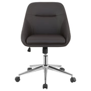 Wrapped in soft and smooth leatherette, this modern office chair features contoured edges for an elegant, contemporary silhouette. Lean against the supportive, comfortable backrest as you focus on work and other tasks. The seating also features a pintuck design and sloped armrests that lend a clean look that is easy on the eyes. Supported by a five-caster wheelbase in a polished chrome finish, this office chair glides across the floor to retrieve office supplies and effortlessly slides beneath a desk at the end of the day. A pneumatic lift also allows you to adjust the height for a more ergonomic seating position. Key Features: • Wrapped in soft and smooth leatherette, this modern office chair features contoured edges for an elegant, contemporary silhouette with a pintuck design and sloped armrests • Supportive and comfortable backrest allows you to lean against it while focusing on work • Five-caster wheelbase in a polished chrome finish glides across the floor and slides beneath a desk • Pneumatic lift allows you to adjust the height for a more ergonomic seating position • Eyes-pleasing design with clean look