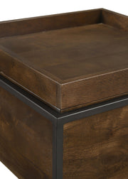 Versatile and perfect for compact homes and spaces, this accent table offers up plenty of interior storage. Designed with a minimalist aesthetic, this accent table features an open cube-inspired iron base with slim corner frame edges in a gunmetal finish. A hidden X-shape support floats the main wood feature, an eco-friendly mango wood storage area with a tray top, which offers a rustic charm with its dark brown finish. A removable tray top invites you to store throws, linens and more inside. A perfect addition for multipurpose spaces like guestroom home offices and other compact rooms.