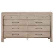 With softened curves and a sculpted profile, this nine-drawer dresser brings refined balance to the bedroom. Arched corners frame spacious drawers with gentle ease, while antique-finished hardware adds a whisper of vintage charm. A hidden jewelry tray and felt-lined top drawers elevate everyday use with thoughtful luxury. Crafted from mahogany, engineered wood, and mango veneer, it offers enduring grace and generous storage. Key Features: • Nine-drawer dresser with rounded edges and sculpted profile for graceful bedroom storage • Weathered mango finish brings natural warmth and subtle wood grain texture • Felt-lined top drawers offer soft storage for delicate pieces and daily essentials • Hidden jewelry tray in upper right drawer adds refined organization and security • Heavy duty drawer glides ensure smooth, quiet drawer function over time • Crafted from mahogany, engineered wood, and mango veneer for durable structure