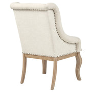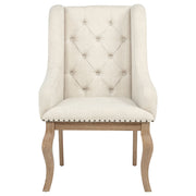 Elegance meets comfort in this upholstered dining arm chair, where graceful curves and refined detailing create timeless sophistication. The swooping rolled arms and diamond tufted backrest offer a classic silhouette enhanced by bronze nailhead trim. Soft cream upholstery pairs beautifully with the warm barley brown wood base, while plush foam cushioning ensures a supportive seat. Crafted from solid rubberwood, this arm chair adds a touch of luxury and durability to any transitional dining space. Key Features: • Dining arm chair showcases rolled arms and tufted back for timeless sophistication • Barley brown wood tone contrasts beautifully with cream upholstered fabric seat • Bronze nailhead trim outlines the silhouette for refined transitional appeal • Curved front and back legs add graceful character to the overall design • Crafted from solid rubberwood with foam cushioning for comfort and strength • Perfect for formal dining rooms blending elegance, comfort, and durability