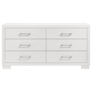 Gracefully proportioned and thoughtfully designed, this six-drawer dresser pairs timeless sophistication with modern simplicity. Smooth-gliding drawers offer generous storage, while felt-lined top drawers cradle delicate keepsakes with care. Sleek bar pulls glimmer softly against the wood’s natural warmth, balancing strength with subtle elegance. Built for lasting beauty and everyday function, this dresser enriches any bedroom with understated allure and enduring style._x005F_x000D_ Key Features: • Cool six-drawer dresser with crisp silhouette and smooth modern form • Bright snow white finish lightens and refreshes bedroom interiors • Felt-lined top drawers keep delicate items protected and organized • Silver-tone bar pulls highlight the dresser’s sleek contemporary look • Durable rubberwood and engineered wood provide strength and stability • Fully assembled design offers ready-to-use convenience and style