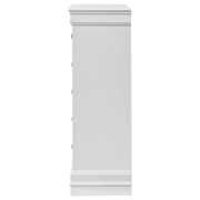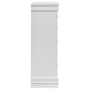 Add depth to a traditional decor scheme with this five-drawer chest. Simple and elongated, the silhouette features wood veneer and select hardwoods. Radiate classic style and sophistication with a warm cappuccino finish. Contrasting nickel bail drawer handles are a modern upgrade. The English dovetail construction provides structure that is perfect for storing linens and extra clothing. Key Features: • Five-drawer chest made from wood veneer and select hardwoods for a sturdy and durable storage solution • Features a warm cappuccino finish, adding a touch of classic style and sophistication to any room • Equipped with contrasting nickel bail drawer handles for a modern touch and easy access to stored items • Built with English dovetail construction, ensuring a robust structure for storing linens and extra clothing • Elongated silhouette design, perfect for adding depth to a traditional decor scheme