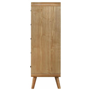 Stylishly organize your wardrobe with this mid-century modern chest of drawers, built with pine, engineered wood, and walnut veneer for durability and style. Featuring five spacious drawers, it offers ample storage for clothing and accessories. Rounded edges and tapered legs lend retro flair, while felt-lined top drawers add a touch of functionality. Smooth drawer glides and subtle metallic hardware complete this elegant storage piece. Key Features: • Five-drawer chest with a dark walnut finish for a bold look • Rounded edges and tapered legs enhance retro-inspired charm • Felt-lined top drawer provides safe storage for valuables • Pine, engineered wood, and walnut veneer construction ensures sturdiness • Metallic hardware adds a polished finishing touch • Smooth-gliding drawers offer effortless access