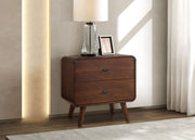 Enhance bedside functionality with this mid-century modern nightstand, crafted from pine, engineered wood, and walnut veneer for lasting durability. Featuring rounded edges, tapered legs, and a sleek silhouette, it adds a touch of retro sophistication to your space. Two spacious drawers, including a felt-lined top drawer, provide ample storage for nighttime essentials, while dual USB ports make it easy to charge your devices at the bedside. Key Features: • Two-drawer nightstand with a rich dark walnut finish • Rounded corners and tapered legs exude retro charm • Felt-lined top drawer protects delicate items like jewelry • Dual USB ports for convenient bedside device charging • Made from pine, engineered wood, and walnut veneer for durability • Smooth-gliding drawers ensure effortless operation