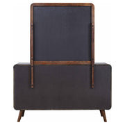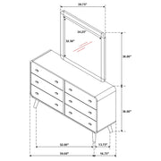 Achieve the perfect blend of style and functionality with this mid-century modern dresser and mirror set. The dresser, constructed with pine, engineered wood, and walnut veneer, features six spacious drawers with felt-lined top drawers for organizing wardrobe essentials. Rounded edges, tapered legs, and a clean silhouette highlight the retro-modern appeal of this timeless duo. The matching mirror completes the set with its sophisticated design and polished details. Key Features: • Dark walnut dresser and mirror set with a cohesive aesthetic • Six spacious drawers with felt-lined tops protect delicate items • Rounded edges and tapered legs add retro-modern appeal • Mirror features a rich walnut veneer frame with soft wood grain detailing • Constructed from pine, engineered wood, and walnut veneer for durability • Timeless design blends function with mid-century elegance