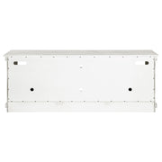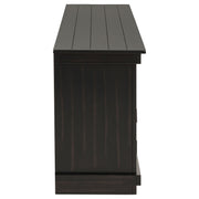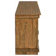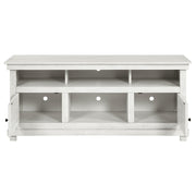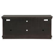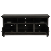 Complete a media center in your inviting home with a modern farmhouse TV stand. It's an approachable design with roughhewn wood details that create texture and dimensionality in your living space. Two shelves and six compartments create ample storage, perfect for everything from peripherals and accessories to personal decor. The media console features a clean-lined silhouette with a slim profile, perfect for a flat panel or wall-mounted television. This TV stand accommodates televisions up to 65 inches. Key Features: • Roughhewn wood markings add artisan character to a modern farmhouse TV stand • A distressed finish lends casual farmhouse character in your den or living room • Two open shelves provide space for media and gaming peripherals and decor • Six compartments storage that's perfect for accessories and media like games and controllers • A slim, straight-lined silhouette supports a flat panel television up to 65 inches