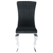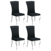 This elegant side chair completes a room in sleek, sophisticated style. Its front legs boast a cool, quirky, curved design for an unexpected touch of creativity. All four legs are finished in chrome, adding a brilliant hint of shine. Its seat is upholstered in soft, luxe velvet, giving it an exquisitely appealing texture. This chair is available in multiple colors, giving you a variety of options to enhance your home. Key Features: • The look of elite luxury is yours with our stunning dining collection • Luxurious velvet and chrome are perfect for formal dining area or to dress up your everyday dining • Chair legs mimic the dramatically curved table legs, also in polished chrome • Sleek black or chic grey velvet upholstery lends plush softness to the roll back design of the side chairs • Stainless steel provides a sturdy frame for this glamorous dining collection