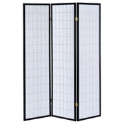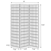This three-panel room divider brings timeless elegance and versatile function to any living area. A classic Shoji screen design with crisp white panels and linear grid details offers both privacy and subtle style. Built with a sturdy rubberwood frame and durable fabric inserts, it provides lightweight portability and lasting quality. Ideal as a decorative backdrop or partition, this folding screen enhances bedrooms, living rooms, or home offices with understated charm. Key Features: • Three panel room divider in black finish, linear grid, folding hinges, solid pine frame • Three panel design in black finish, white fabric panels, grid lattice, lightweight fold • Folding design in black finish, brass tone hinges, solid pine frame, durable fabric inserts • Black finish with white inserts, stable three way hinges, solid pine and fabric build • Black finished solid pine frame with polyester rayon panels, easy fold for quick repositioning • Black finish, crisp grid detail, fabric inserts diffuse light, solid pine adds stability