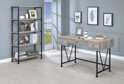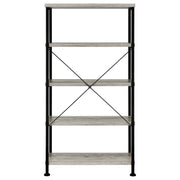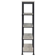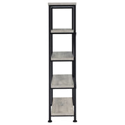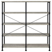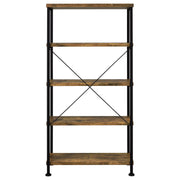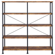 Embrace a traditional look with contemporary upgrades. Choose this bookcase to organize accents and books in a transitional space. Minimalist styling reflects a classic dynamic reflecting a hint of industrial aesthetics. Find plenty of room on four side shelves to display books and decor. Select from finishes that suit your space. Key Features: • Double bookcase with four extra-wide tiers for ample display and storage space • Rustic nutmeg finish offers a warm wood tone with industrial character • Black powder-coated steel frame enhances contrast and structural stability • Crossbar detailing on the back reinforces support without adding bulk • Open shelf design keeps contents visible and accessible from all sides • Made from engineered wood, melamine paper, and heavy gauge metal