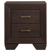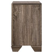 Crisp lines and warm hues are showcased in this transitional two-drawer nightstand. Covered in a soft washed taupe finish, the clean silhouette is given visual intrigue with an exposed wood grain in natural oak. Elongated, crisp metallic hardware creates sleek contrast. Constructed with black recessed grooves around picture framed case fronts, the front of the frame is elongated with tapered legs. Dress up the greyish brown hue of the patina with a vase of fresh flowers or a sculpture-inspired lamp. Key Features: • Two-drawer nightstand with a clean rectangular silhouette and tapered block feet • Washed taupe finish highlights a weathered wood grain with natural oak character • Framed drawer fronts feature black recessed grooves for dimensional contrast • Sleek chrome metal handles add a modern touch to the transitional profile • Drawers equipped with Kenlin glides for quiet and smooth everyday use • Built from engineered wood, scratch-resistant veneer, and composite core