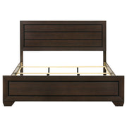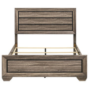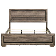 Make a statement in a transitional room. Cherish the linear styling and fresh finish of this sophisticated bed. An extra high headboard with horizontal planks hint at a nature-inspired theme. With a gorgeous grey patina in a greyish brown tone, its washed taupe finish is wonderfully versatile. A framed case front adds dimension and elegance. Key Features: • Panel bed with horizontal recessed detailing and bold rectangular framing • Washed taupe finish showcases wood grain with black contrast groove accents • Picture frame styling on headboard and footboard adds structure and depth • Requires foundation and includes a supportive slat system with center legs • Stands on sturdy tapered feet that elevate the streamlined silhouette • Built from engineered wood with a durable laminate and composite core