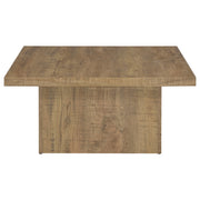Natural ambiance brings a fresh motif to your casual spaces in the form of a square wood coffee table with the power to change up a design scheme. The square coffee table reflects a heady natural vibe with wood grain markings on natural mango finish wood products construction. Its spacious overhang top and oversized block base create delightful optical effects with a low-key feel. Centered in a casual yet elegant room, it speaks to your signature organic design statement. Experiment with suitable ensemble pieces to make the rustic look of this cocktail table a main factor. Key Features: • Square coffee table made from engineered wood with laminate veneer for durability • Features a natural mango wood look with visible grain markings for rustic charm • Spacious overhang top provides plenty of room for display and functionality • Oversized block base adds to the table's sturdy and balanced design • Eco-friendly laminate veneer offers a scratch-resistant surface for longevity • Ideal for casual, rustic interiors seeking a natural and understated aesthetic