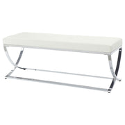 Light and airy ambiance offers a lift to modern bedrooms and living spaces. With a tasteful minimalist profile, this elegant bench delivers a perfect blend of style and substance. Sit on a padded surface wrapped in white leatherette upholstery. Enjoy the romantic accent of a chrome finish metal frame with gentle contours. Choose this bench for overflow seating in a central room, or an intriguing addition to entryway spaces. Key Features: • Accent bench with white leatherette seat and tufted details • Padded cushion offers comfort for entryways or bedroom seating • Sleek curved metal base in polished chrome for modern appeal • Minimalist style suits contemporary, glam, or transitional spaces • Upholstered in durable faux leather with smooth polyurethane texture • Heavy gauge metal base provides strength and visual lightness