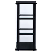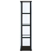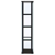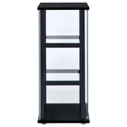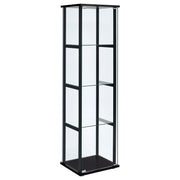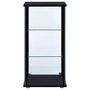 A modern version of a true classic makes a fabulous addition to a transitional space. With linear styling and a fresh look, this curio cabinet offers a perfect venue for showcasing treasured decor. Bold black tops a simple frame, top, and base. Tempered glass shelves create transparent space for display. Access its interior easily with push-to-open doors. Key Features: • Modern curio cabinet in black finish • One reversible magnetic push-to-open clear tempered glass door provides ease of access and strength • Three tiers of shelving for additional display space • Available in a variety of sizes • Glass, pine, particle board, and laminate construction