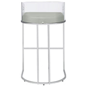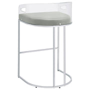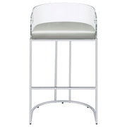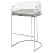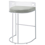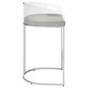 Ultra-modern with a retro-inspired vibe, this pair of stools make a striking piece to a dining room space. With a curved backrest in a clear acrylic material, each stool offers an open and airy design. Rest comfortably on a leatherette cushion as you dine or sip a cocktail. In addition, each stool is supported by a slim metal legs in a lustrous chrome finish and a base shape that mimics the rounded acrylic backrest. Pull up a pair of these stools to a kitchen bar or complete a compact home bar. Key Features: • Ultra-modern with a retro-inspired vibe, these stools feature a curved backrest in clear acrylic and leatherette cushion for comfort • Slim metal legs in a lustrous chrome finish and a base shape that mimics the rounded acrylic backrest provide support • Ideal for a dining room, kitchen bar, or home bar • Open and airy design offers an airy feel • Lustrous chrome finish adds a touch of glamour