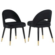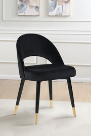 Add a touch of retro-inspired elegance to your dining room with this stylish dining side chair, featuring an elegant bucket-style seat that embodies Mid-Century modern charm. Wrapped in luxurious velvet, each chair provides a supportive, long-lasting seating experience, making it perfect for hosting dinner guests or enjoying a cozy meal. The flared, tapered legs, finished with dramatic gold-capped feet, add a regal Hollywood glam touch that enhances any dining space. This versatile chair effortlessly complements various color palettes and brings a bold statement to both formal and casual settings. Pull these chairs up to a spacious rectangular dining table to create an inviting and chic atmosphere for any gathering. _x005F_x000D_ Key Features: • Retro-inspired dining side chair with a sophisticated bucket-style seat • Velvet fabric upholstery offers a bold statement and complements diverse color palettes • Flared, tapered legs with gold-capped feet add a Hollywood glam touch • Supportive, long-lasting seat ideal for dinner guests and cozy meals • Perfect for Mid-Century modern, contemporary, and Hollywood glam decor styles • Ideal for dining rooms, cocktail nights, or as a stylish accent in any space