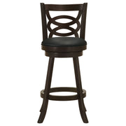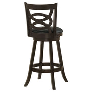 Bring timeless sophistication to your home bar with this swivel bar chair, featuring a cappuccino wood frame and padded black leatherette seat. Its unique open-back design creates an eye-catching focal point, while flared legs and a sturdy round footrest ensure stability. Designed with the comfort of a bar chair and the swivel function often associated with bar stools, this piece blends practicality with elegant design for any bar-height setting._x005F_x000D_ Key Features: • Swivel bar chair crafted for stylish comfort and convenience • Black leatherette seat provides plush cushioning support • Cappuccino wood construction adds warmth and durability • Open-back design creates a distinctive decorative accent • Flared legs and circular footrest ensure balanced stability • Ideal bar chair choice for casual or formal bar-height seating