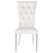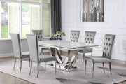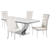 Host a party at this sophisticated modern glam dining table set, designed with a gorgeous polished chrome finish across its demilune pedestal base and four slender dining chair legs. The spacious rectangular table top presents a faux marble top and seats four comfortably and offers plenty of space for family and friends. Slide up in a Parson style dining chair, upholstered in a luxurious velvet fabric that offers a contemporary flair and soft look and feel. Button tufted backrests fan out toward the top, offering a modern expression to their classic silhouettes. Lastly, a beveled edge surrounds the table top, presenting a hint of intricate texture to the sleek aesthetic.