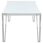 Clean lines and sleek materials give this dining table a distinctly modern edge. The white frosted tempered glass top offers a bright, airy look, while the polished stainless steel frame delivers durability and shine. Designed with geometric, hairpin-inspired legs, this rectangular dining table comfortably seats six and suits both casual and formal dining spaces with effortless style. Key Features: • Modern dining table features a sleek, contemporary silhouette • White frosted tempered glass top creates a clean, sophisticated surface • Polished stainless steel frame adds lasting strength and visual appeal • Hairpin-style legs with exposed corner brackets for a modern twist • Crafted from heavy-gauge metal and 12mm thick glass for long-term durability • Versatile size comfortably seats up to six for everyday or formal meals