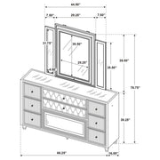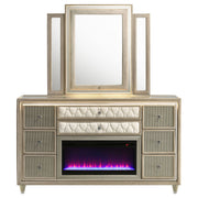 Warmth meets radiance in this dresser and mirror set, where ivory and camel velvet surround every surface. A built-in flame visualizer sits beneath a clear tempered glass top, with LED case lighting adding atmosphere. The tri-panel mirror features LED illumination to complete the glow. Finished with crystal knobs, quilted velvet fronts, and felt-lined drawers, this set pairs soft elegance with practical brilliance, all lifted by solid rubberwood legs. Key Features: • Eight-drawer dresser and mirror set with LED-lit case and flame visualizer (no heat) with remote • Ivory and camel velvet wrap pairs with reflective acrylic for luminous texture • Mirror includes tri-panel design with built-in LED lighting for expanded view • Clear tempered glass tops the dresser for protection and shine • Felt-lined top drawers, dovetail joinery, and smooth glides for quality use • Crystal knobs and solid rubberwood legs provide both sparkle and structural support