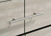 This six-drawer dresser combines modern style with a rustic edge, creating the perfect balance of elegance and functionality for your bedroom. With a rustic cream finish over rough-sawn, white-washed engineered paper veneer, it exudes a warm yet contemporary feel. The extra-wide polished nickel handles add a sleek contrast, enhancing its sophisticated look. Constructed from durable engineered wood, the dresser features English dovetail joinery and Center metal glides, ensuring smooth operation and lasting quality. Its spacious drawers offer ample storage to keep your space organized and stylish.